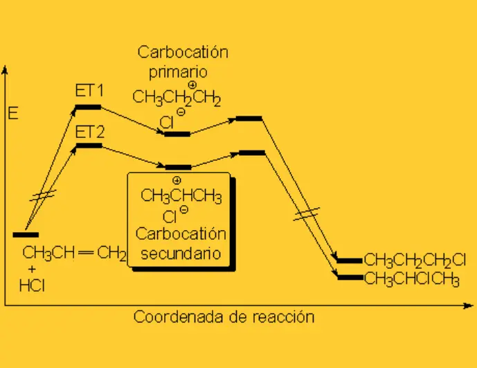 Consideremos la adición de HBr al propeno (CH₂=CHCH₃). Según la regla de Markovnikov, el H se adicionará al carbono terminal (CH₂), formando un carbocatión secundario más estable, mientras que el Br se adicionará al carbono central (CH), resultando en 2-bromopropano (CH₃CHBrCH₃) como producto mayoritario. La formación del 1-bromopropano (CH₂BrCH₂CH₃) es minoritaria.