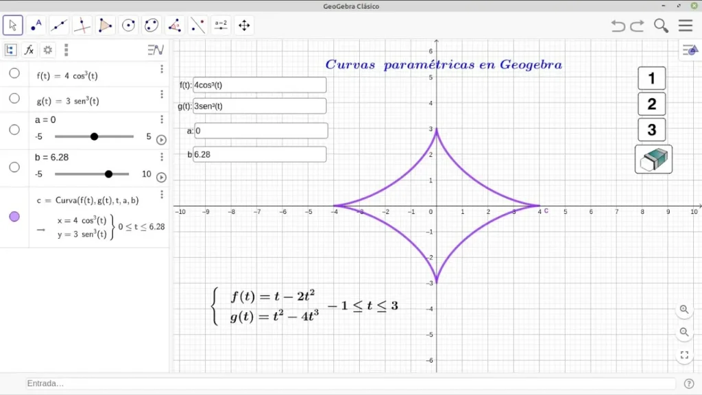 - Software matemático: Programas como GeoGebra, MATLAB, Mathematica y Wolfram Alpha ofrecen funciones avanzadas para graficar curvas paramétricas, incluyendo la capacidad de manipular parámetros, visualizar el trazado de la curva y realizar análisis más profundos.