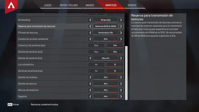 A continuación, analizamos los ajustes gráficos más importantes en Apex Legends y cómo optimizarlos para tu sistema:
