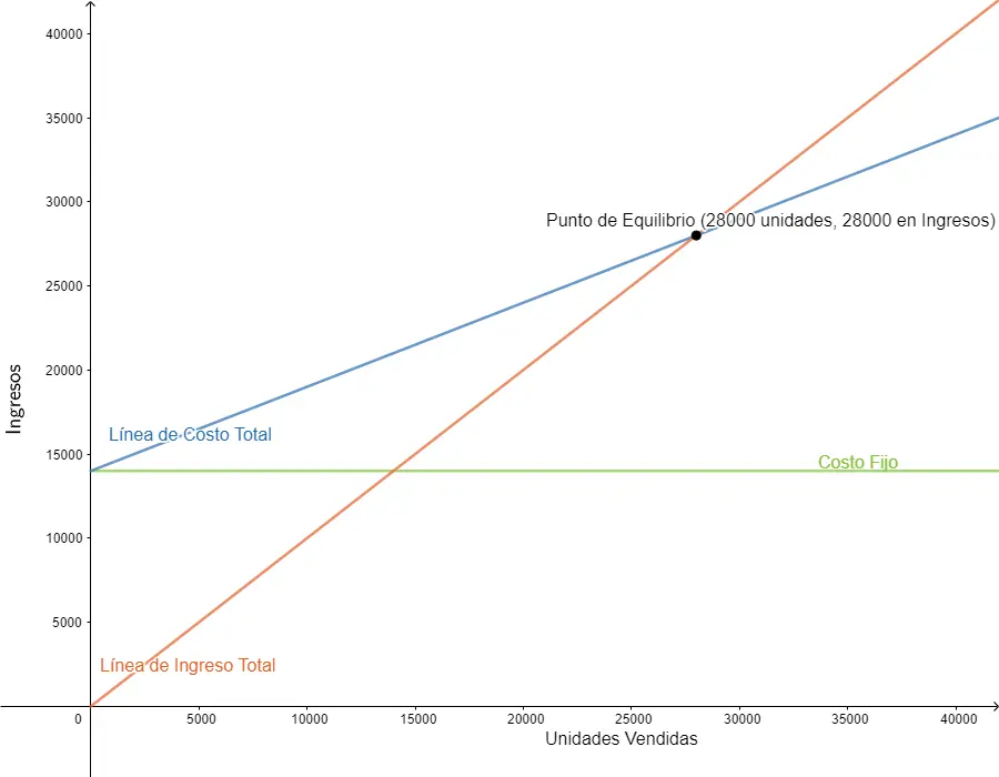 Imaginemos una empresa que tiene costos fijos de $10,000, un costo variable por unidad de $5 y un precio de venta por unidad de $1El punto de equilibrio en unidades sería: 10,000 / (15 - 5) = 1,000 unidades. En el gráfico, la línea de costos totales comenzaría en $10,000 (costos fijos) y tendría una pendiente de $5 por unidad. La línea de ingresos totales tendría una pendiente de $15 por unidad. El punto de intersección se encontraría en 1,000 unidades.