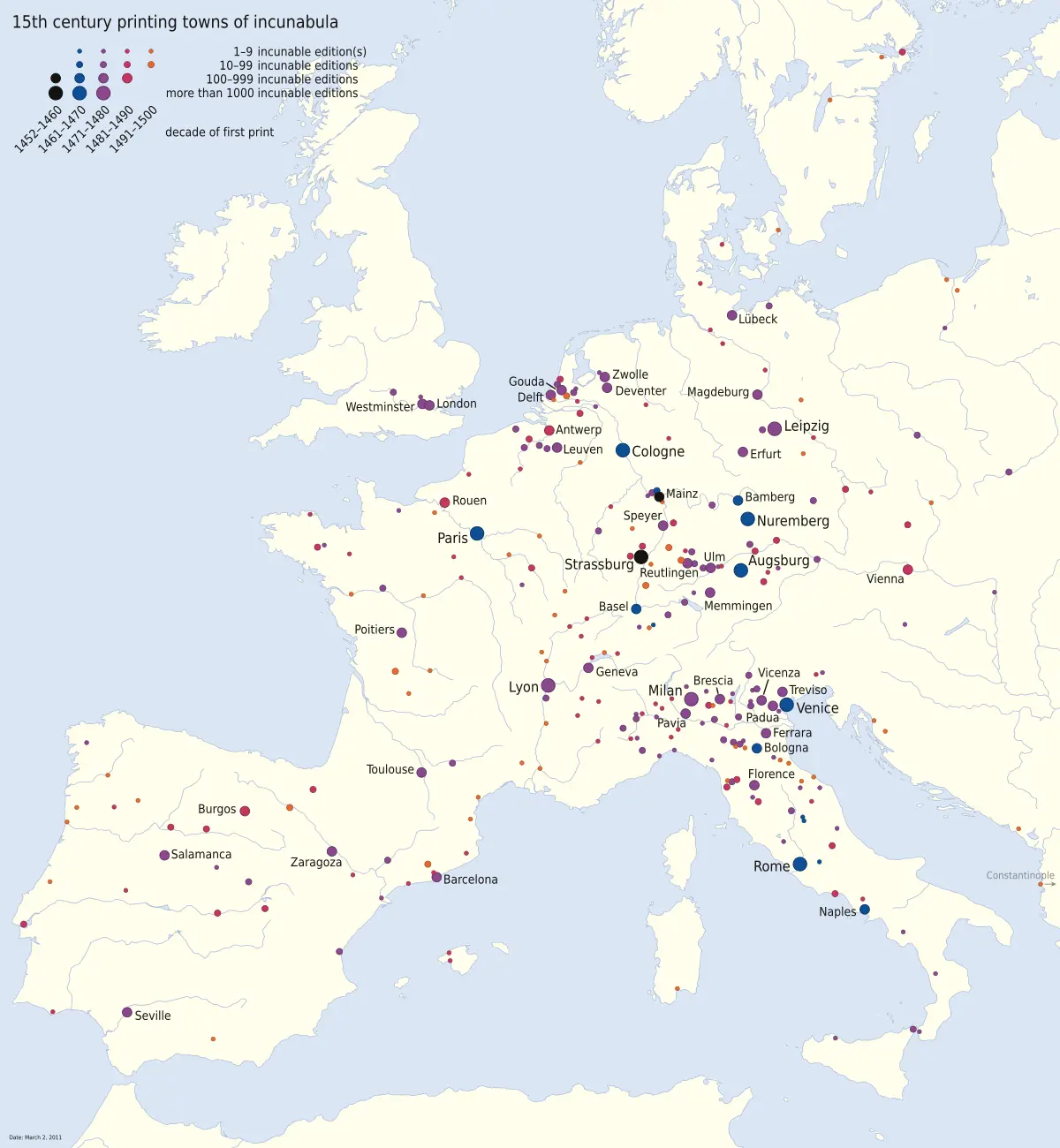 | Expansión por Europa | 1470-1500 | Rápida expansión por Europa Central y Occidental; establecimiento de centros de impresión en importantes ciudades. | Europa Central y Occidental |