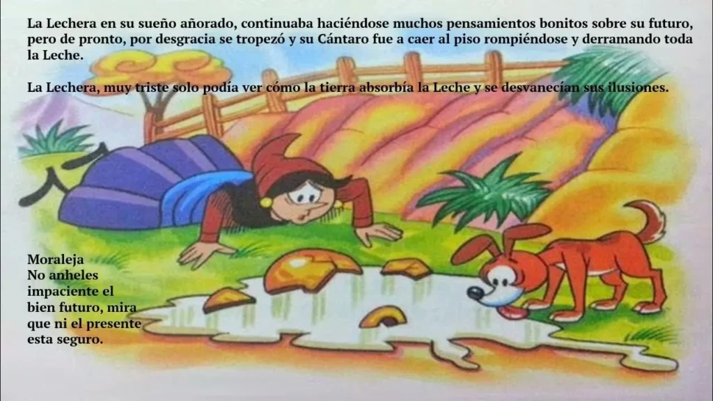 - Lectura en voz alta: Leer la fábula en voz alta, haciendo énfasis en las emociones y las acciones de la lechera.