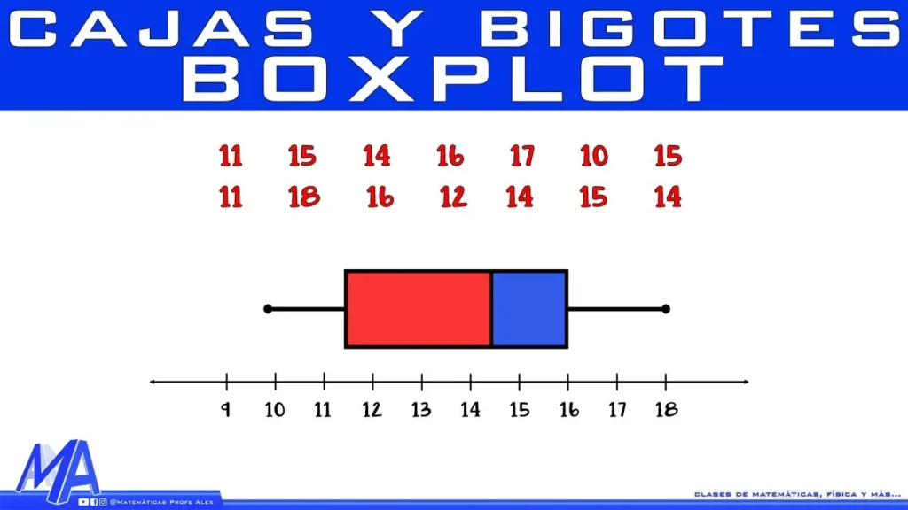 Estos cinco números resumen la distribución de los datos. La caja representa el rango intercuartílico (IQR), que es la diferencia entre el tercer y el primer cuartil (IQR = Q3 - Q1). La mediana se representa con una línea dentro de la caja. Los bigotes se extienden desde la caja hasta el mínimo y el máximo, o hasta un límite determinado para identificar los valores atípicos.