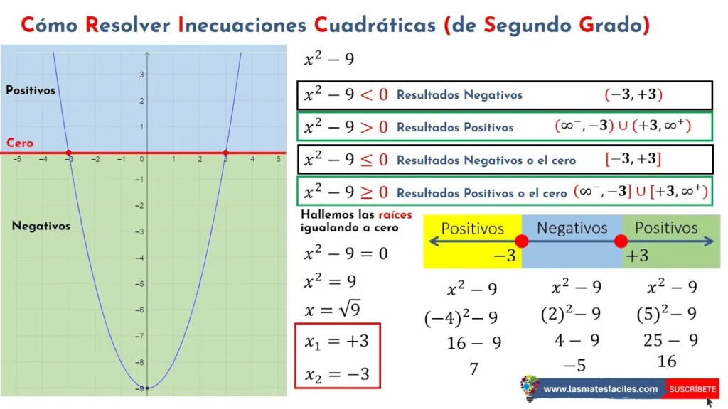- ≤ (menor o igual que): La solución incluye los valores de x para los cuales la parábola está por debajo o sobre el eje x (y ≤ 0).