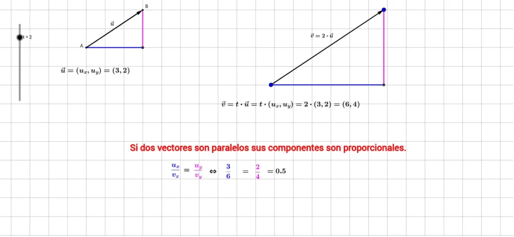 Imagina dos vectores, a = (2, 4) y b = (4, 8). Estos vectores son paralelos porque sus componentes son proporcionales (b = 2a). Gráficamente, ambos vectores se representarían como segmentos de recta con la misma inclinación, aunque b sería el doble de largo que a.