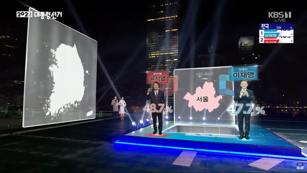 En algunos casos, la combinación de imágenes reales mejoradas con contenido visual virtual resulta ideal. Las noticias y los programas de actualidad son un buen ejemplo. KBS, la cadena de televisión surcoreana, utilizó esta técnica durante las elecciones presidenciales de 202Se empleó un gran volumen LED curvado y tres motores de software Pixotope para recrear la Casa Azul, residencia presidencial, y complementar el decorado con gráficos de alta calidad. El resultado fue una retransmisión altamente atractiva y realista, la más vista de la noche electoral.