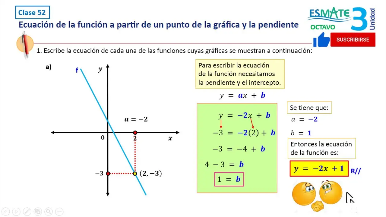 - Intersección con los ejes y pendiente (para funciones lineales): Determina la intersección con el eje y (b) y la pendiente (m). La ecuación de la recta es y = mx + b. Traza la intersección con el eje y y utiliza la pendiente para trazar otros puntos.